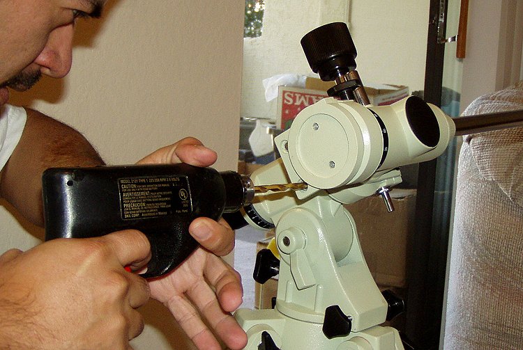 The 8" Orion OTA has a greater outer tube diameter than the Helios. Therefore, the ring bolts had to be replaced with longer ones. These are 3 1/2" long 1/4" bolts from the toolbox. 3" would be better (note the spacers) but did not have. The tube is also 18" longer and about 8 lbs heavier, but the mount is up to the task.
