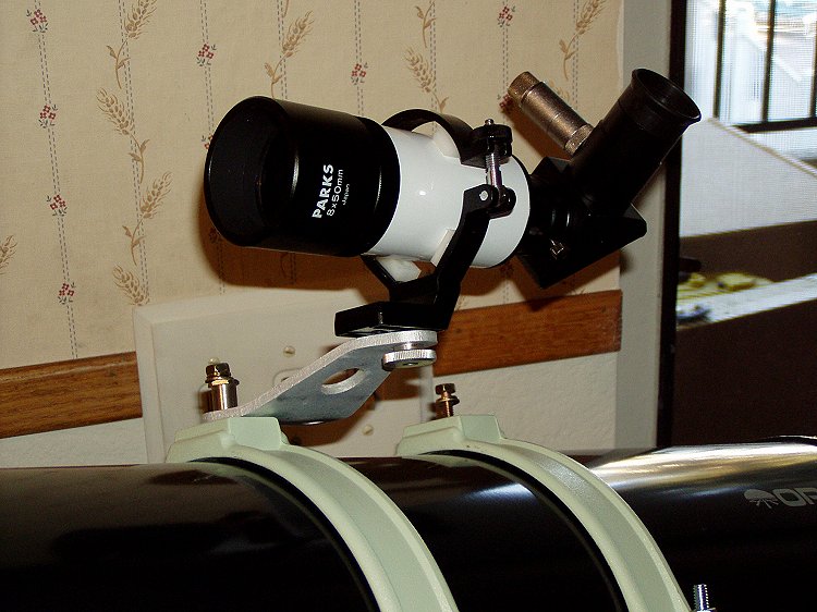 The Parks 8x50 illuminated guidescope is attached to one of the auxiliary mounts on the Helios rings.