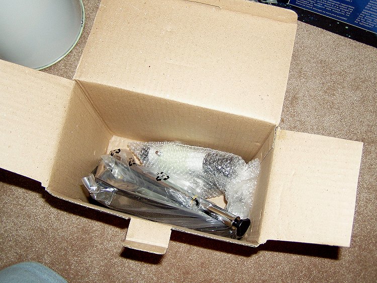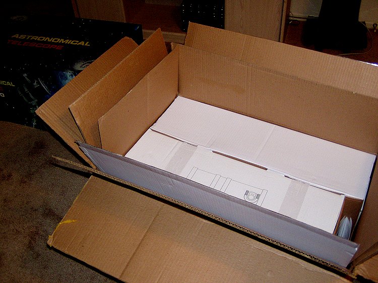 The accessory box. Note the inadequate padding. If the carrier handles the box roughly (known to happen), the heavy counterbalance shaft could punish the fragile finderscope.
