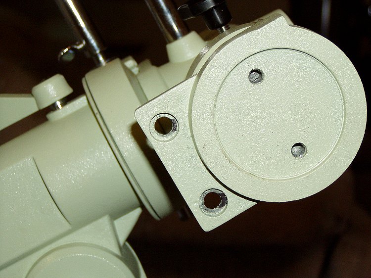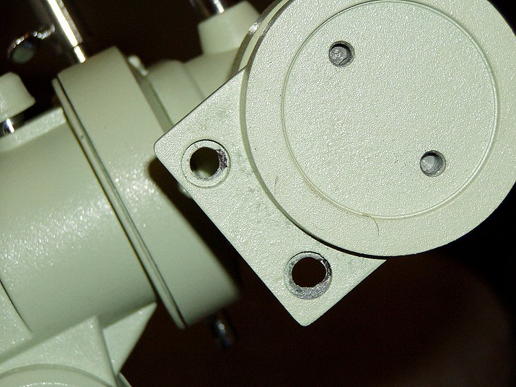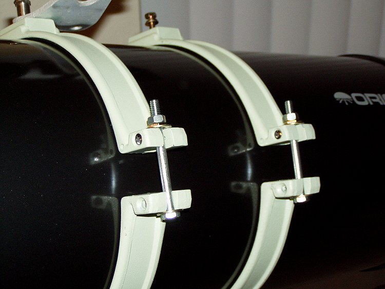 The 8" Orion OTA has a greater outer tube diameter than the Helios. Therefore, the ring bolts had to be replaced with longer ones. These are 3 1/2" long 1/4" bolts from the toolbox. 3" would be better (note the spacers) but did not have. The tube is also 18" longer and about 8 lbs heavier, but the mount is up to the task.